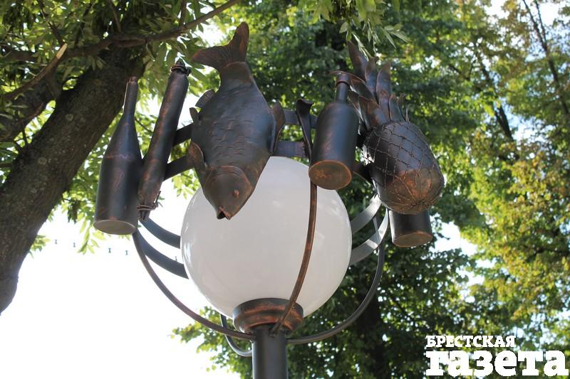 Теперь в Бресте появились официальное место для поцелуев, счастливый сапог, «денежный» фонарь. И даже красуется сам бог огня Гефест. Несколько фонарей посвящены гастрономической тематике.