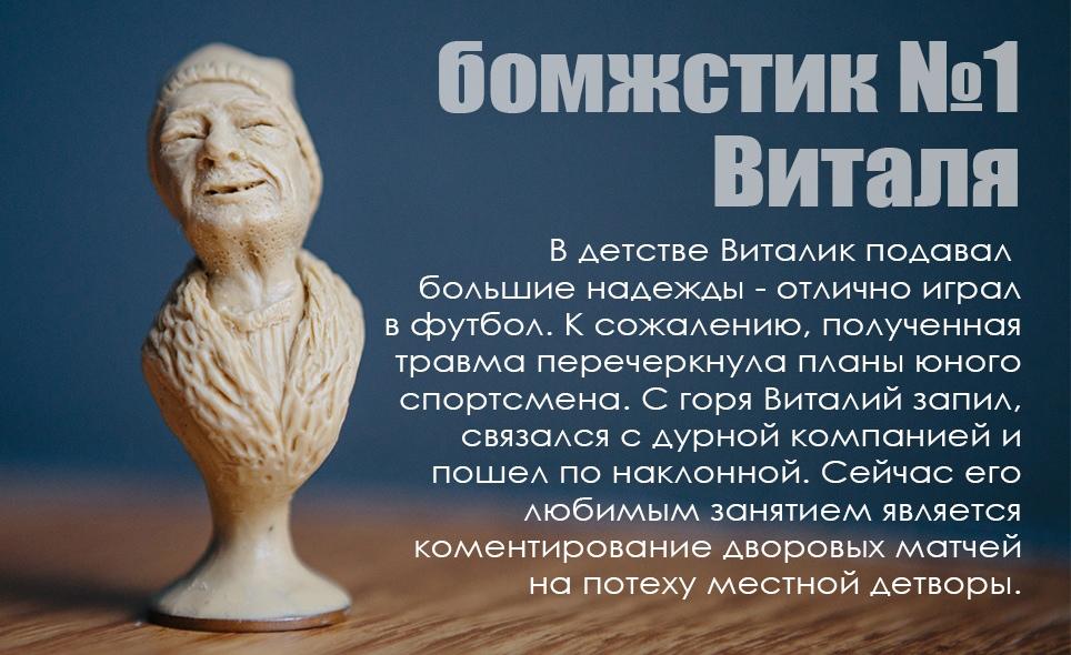 У бомжтиков есть биографии. Например, пишет дизайнер, бомжстик Боря «в молодости слыл интеллектуалом. Внешняя схожесть с актером Валентином Гафтом сыграла с ним злую шутку. Люди часто приглашали его выпить (дабы быть ближе к искусству), а Боря был не в силах устоять перед халявной выпивкой». А бомжстику Витьку «мама говорила: «Не свисти — денег не будет!» Теперь, не обремененный финансовыми проблемами, Виктор может свистеть день напролет и ничего не опасаться. Жизнь хороша, когда свистит душа! Так держать, Витя!»