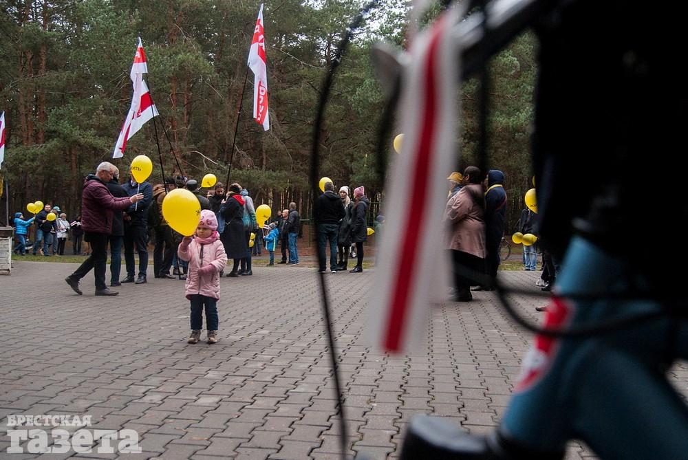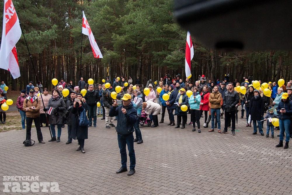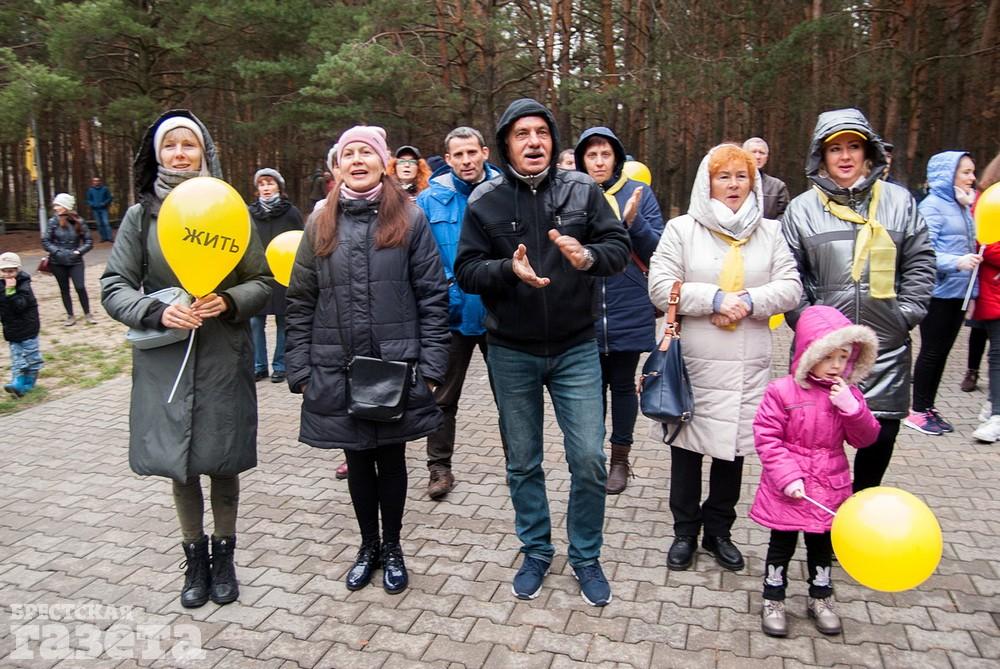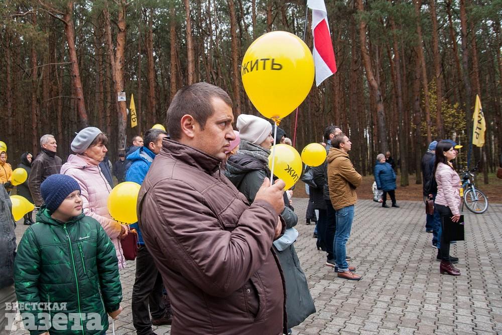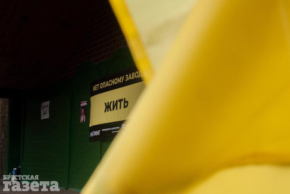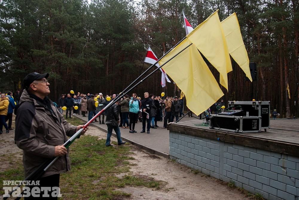 Собравшиеся держали бело-красно-белые флаги, флаги движения «За Свободу», желтые шары и желтые флаги со словом «Жить» как символом борьбы против аккумуляторного завода.