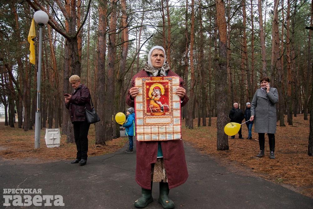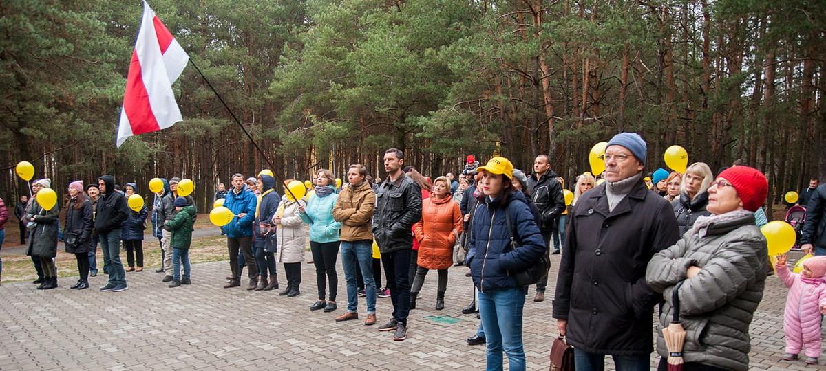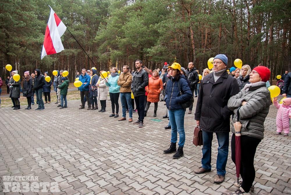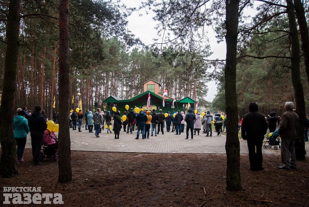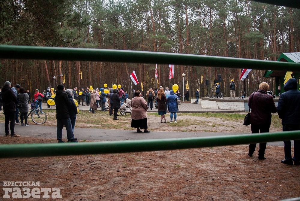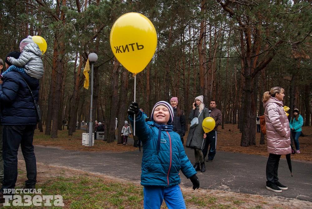 Собравшиеся держали бело-красно-белые флаги, флаги движения «За Свободу», желтые шары и желтые флаги со словом «Жить» как символом борьбы против аккумуляторного завода.