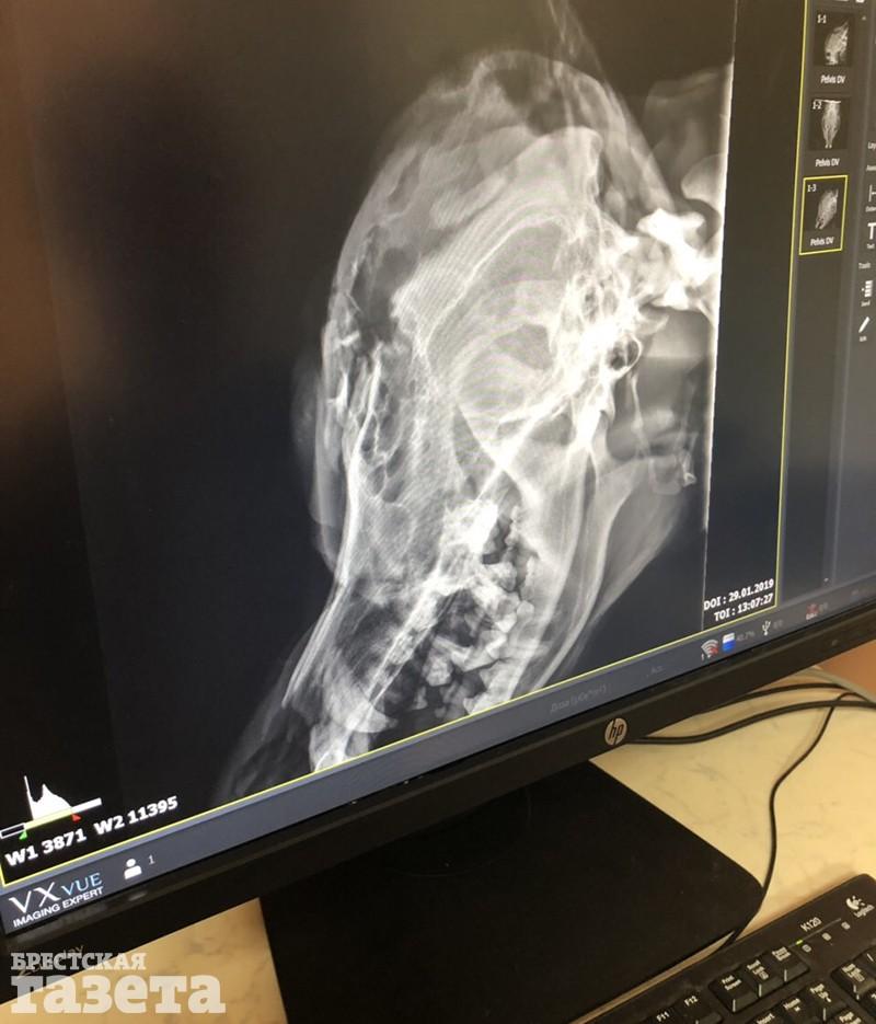 Также на снимке, сделанном травматологом, видно, что в черепе собаки много осколков, но доктор сказал, что трогать нельзя. Со временем должна образоваться костная мозоль. Саму рану зашили, но оставили отверстие для жидкости. Животное сейчас находится на антибиотиках.