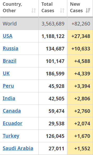 Коронавирус в мире: в десятке стран, где было больше всего новых случаев за 3 мая, нет ни одной страны Евросоюза