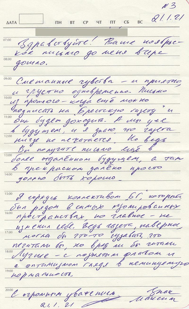 В четверг 28 января в редакцию «БГ» пришло письмо от политзаключенного Максима Знака, датированное 21-м числом этого же месяца. Он сообщил, что до него только вчера — 20 января — дошло ноябрьское письмо от «БГ».