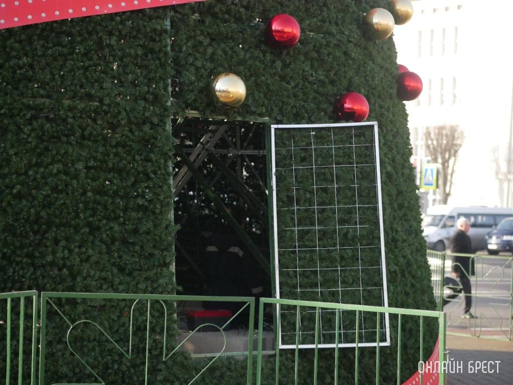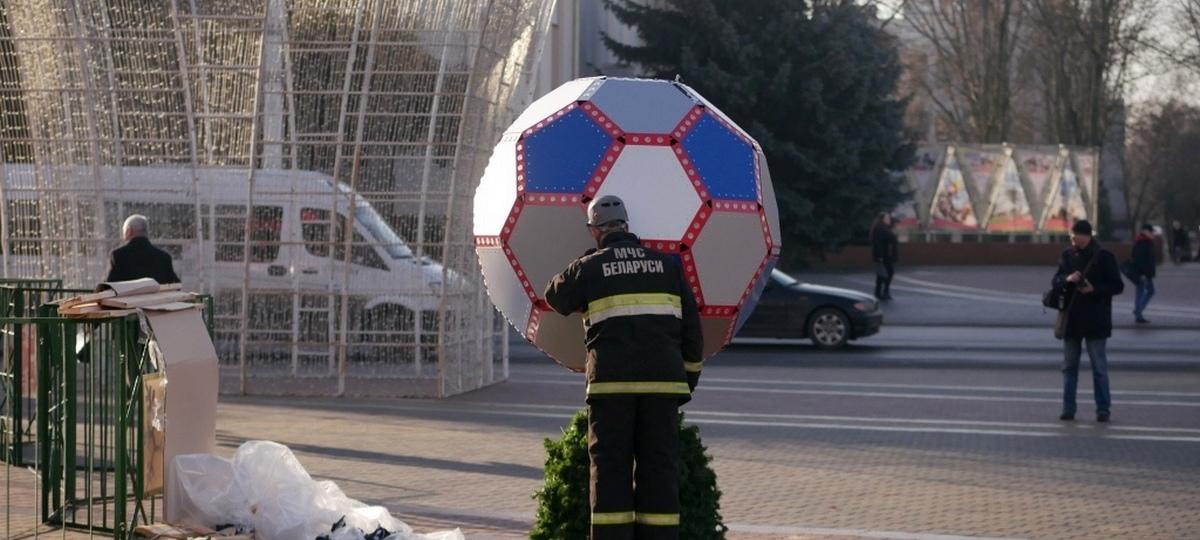 Днем 20 декабря на главной елке Бреста на площади Ленина появился обещанный футбольный мяч. Его установку запечатлел на фото «Онлайн Брест».