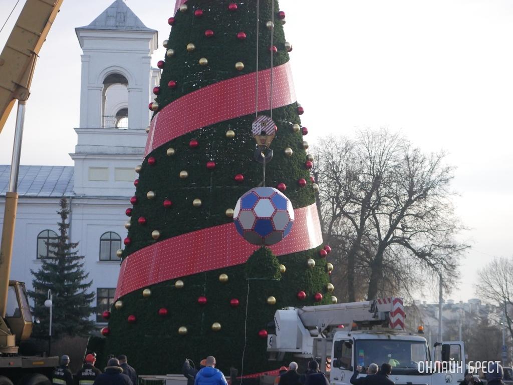 Посмотрите, как выглядит главная елка Бреста с футбольным мячом на верхушке (много фото + видео)