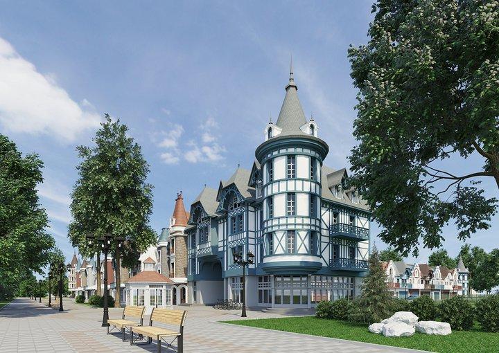 Архитектура его фасадов решена в двух стилевых направлениях, представляющих атмосферу городков французской Нормандии.