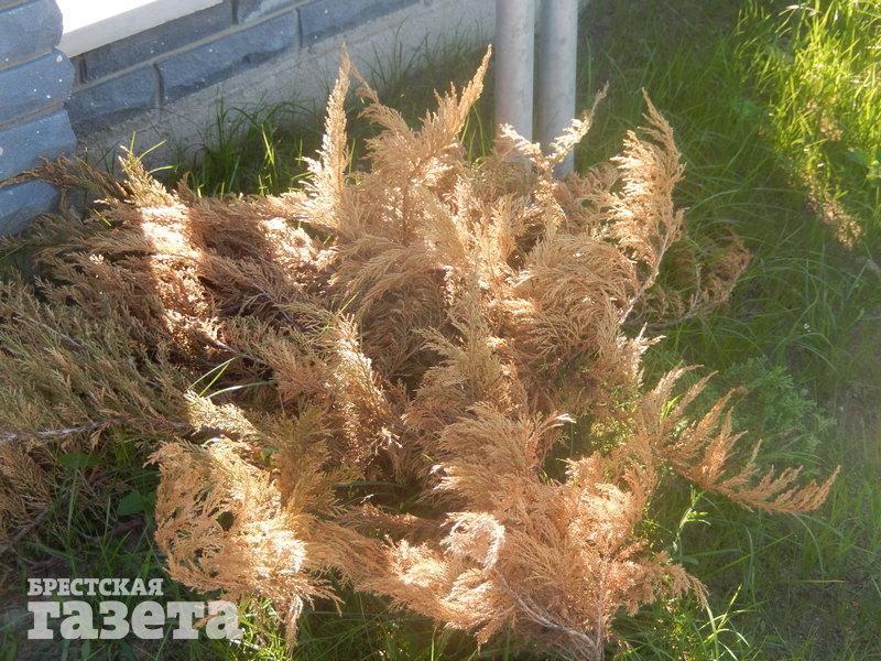 Ул. Высоковская, 44. Растение у дома пропало, несмотря на уход за ним и полив. И, не одно оно, погибли две яблони, черешня, туя. Фото:
