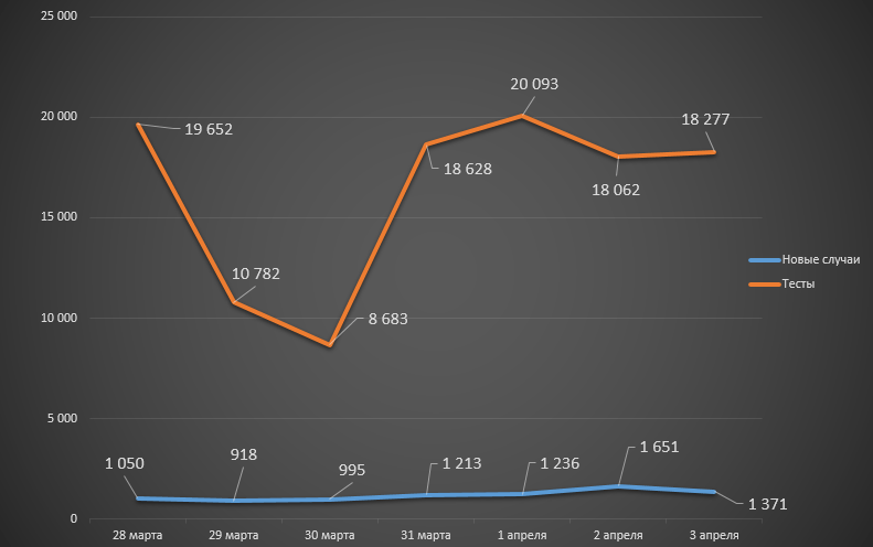 Что касается количества выполненных тестов, то за период с 28 марта по 3 апреля их число составило 114 177 (на предыдущей неделе – 113 034), а официальная смертность поднялась на 2: неделей ранее было зафиксировано 63 летальных исхода, за последние исследуемые семь дней – 65. Отметим, что максимальная ежедневная смертность достигла 10-и человек.