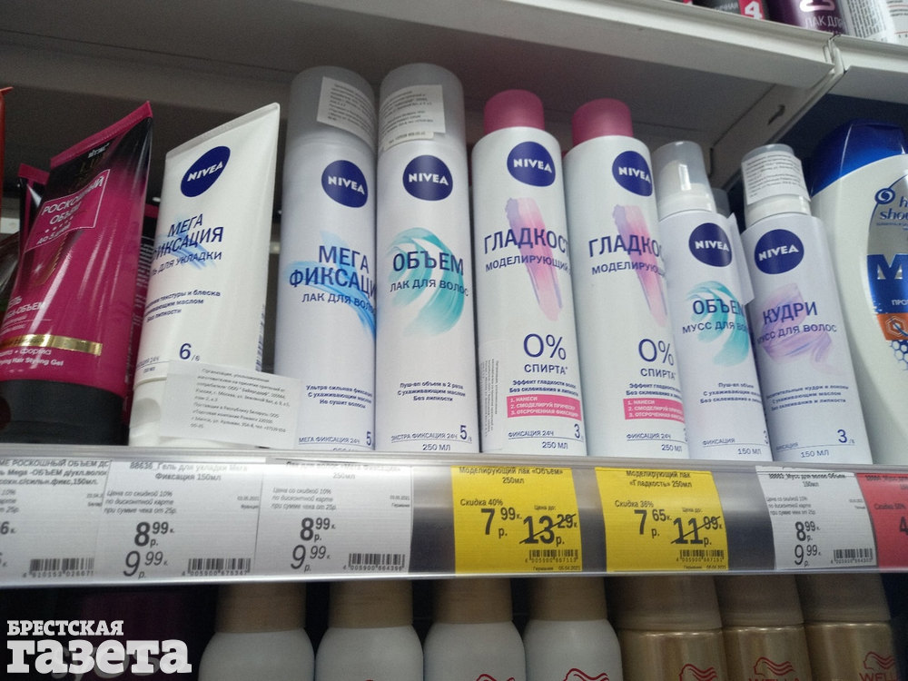 На полках некоторых брестских магазинов, где стоят шампуни, крема и другая уходовая косметика, продукцию вышеуказанной марки не удалось найти уже сегодня в первой половине дня. Нет, их не раскупили, а просто решили снять с полок на день раньше. А в других торговых точках, причем, в ассортименте, по «старой» цене и без скидок Nivea имелась.