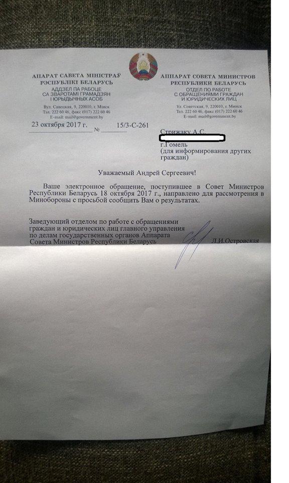 «Итак, Совмин решил отправить наше обращение в Минобороны. Ответ датирован 23.10, как и предыдущий ответ из Администрации президента, и забавно то, что уже на следующий день Лукашенко на совещании раскритиковал своих чиновников за «бюрократический футбол» с обращениями граждан. В общем, матч продолжается: первый пас администрация дала Совету Безопасности, второй пас Совмин дал Минобороны. Куда мяч в 9 614 подписей, собранных на Zvarot.by полетит еще?» — спрашивает на своей странице в Фейсбук Андрей Стрижак.