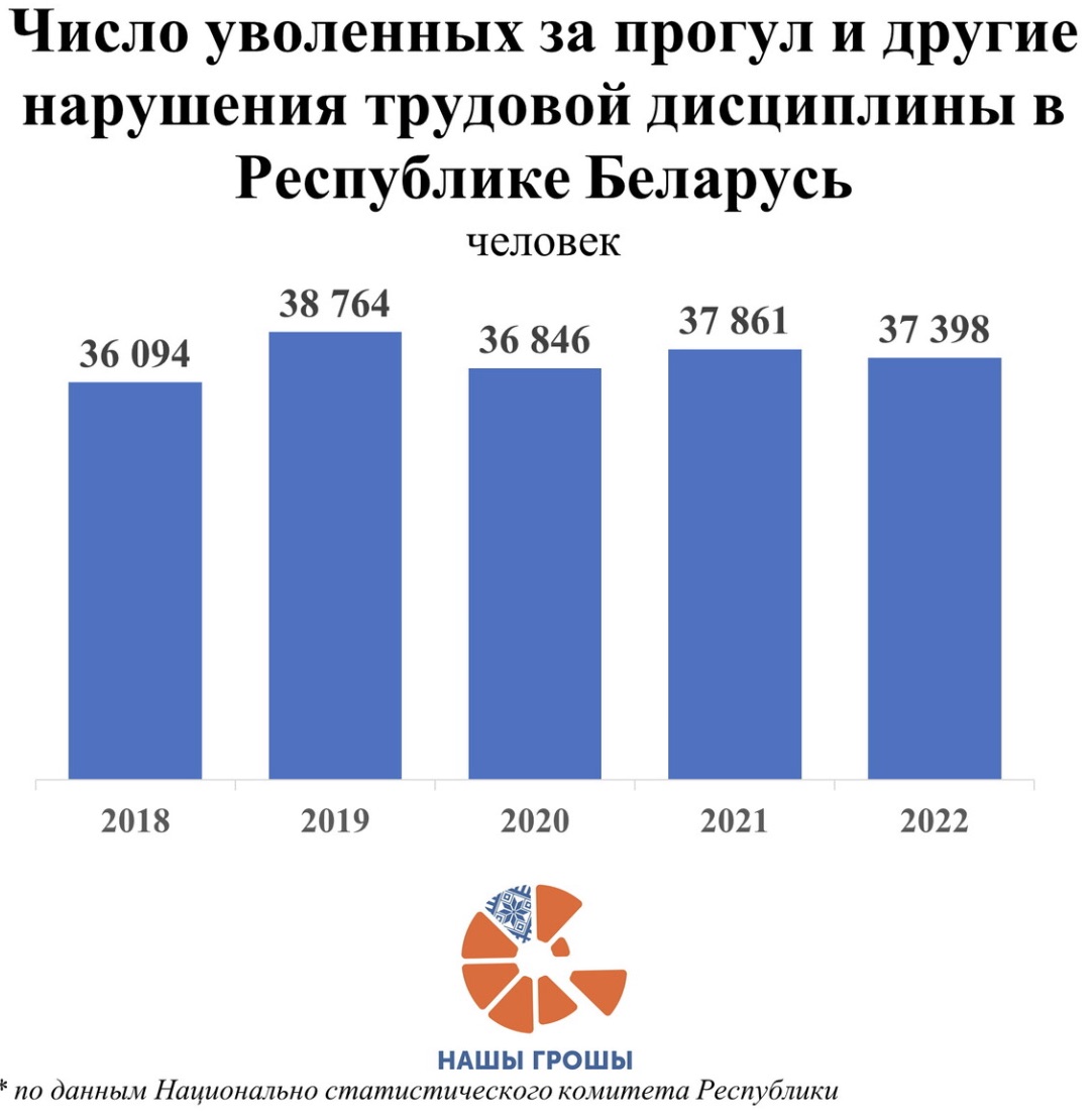Из актуальных данных Белстата следует, что по причине прогула и других нарушений трудовой дисциплины только за прошлый год было уволено более 37 тысяч человек.  Много это или мало? Если соотнести с общим числом увольнений за год, то выходит, что прогульщиков наберется около 5%. Причем эта цифра относительная стабильна.