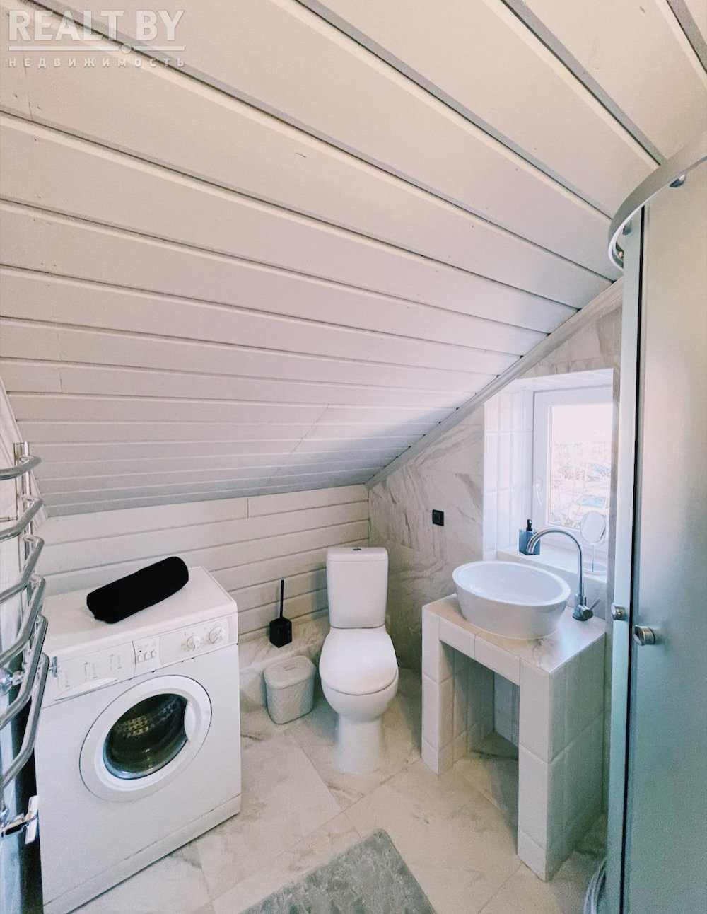 Наконец, из спальни можно попасть в санузел. Он совмещенный, с небольшим окном. Есть душевая кабина и стиральная машина.
