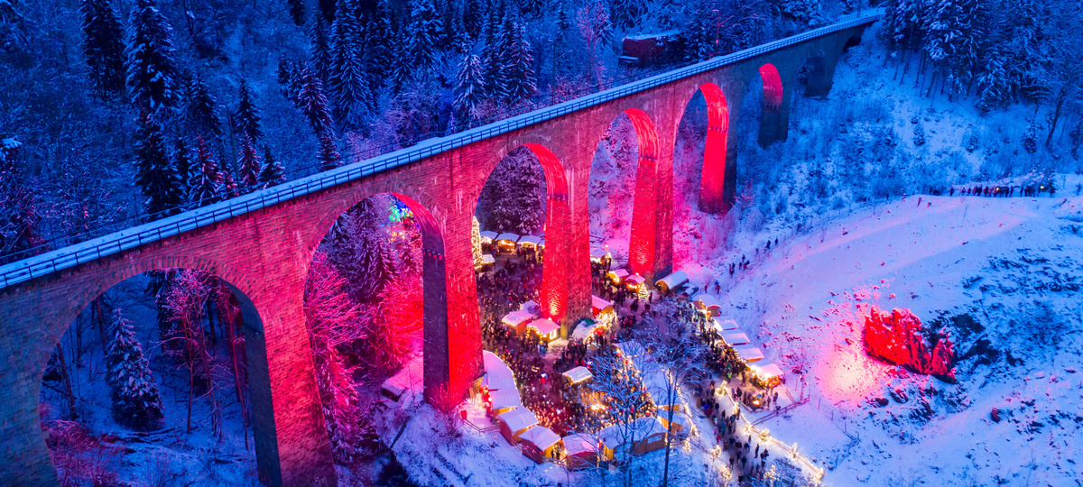Выглядит этот рождественский рынок потрясающе, ведь расположен под 40-метровым виадуком из песчаника, который является частью железной дороги Долины дьявола. Представьте себе скопление уютно светящихся домиков у подножия старинного арочного моста. Вокруг ничего, кроме безмятежности безмолвных деревьев и холмов, укутанных снегом.
